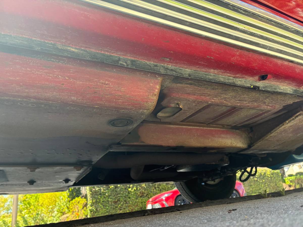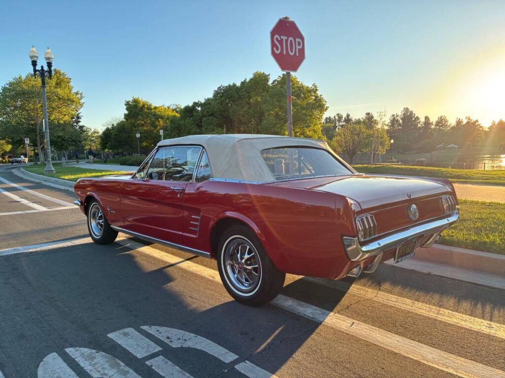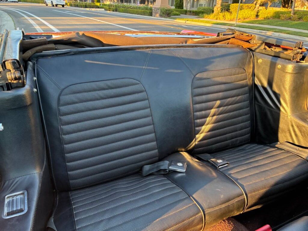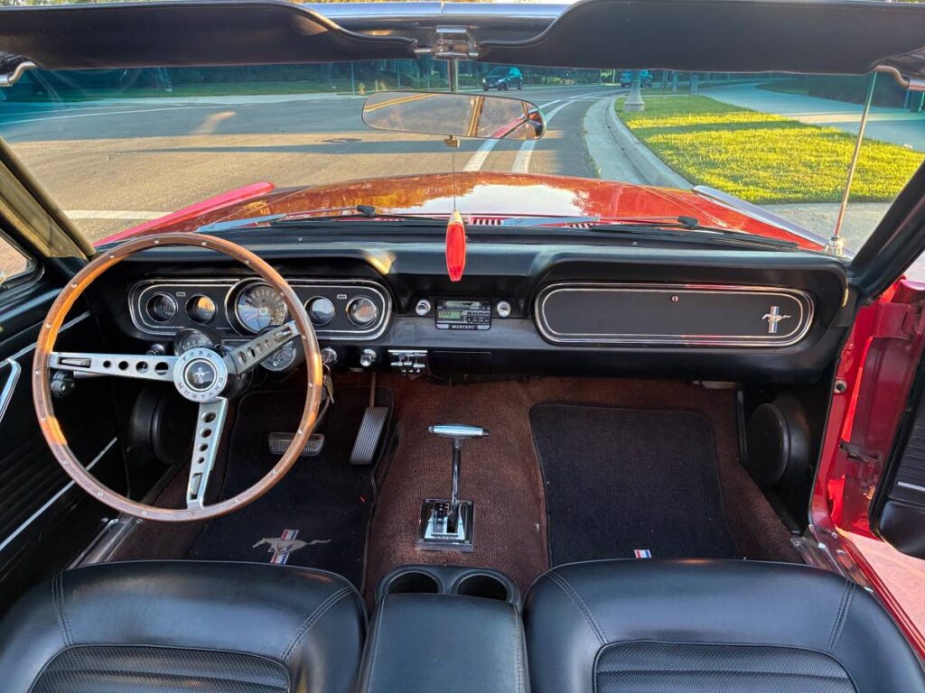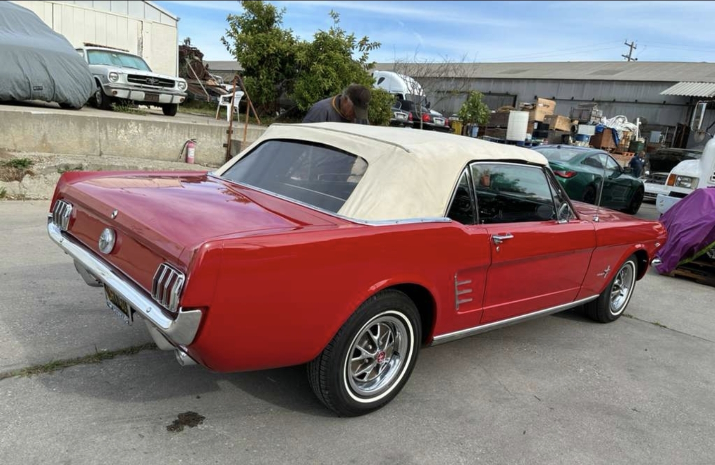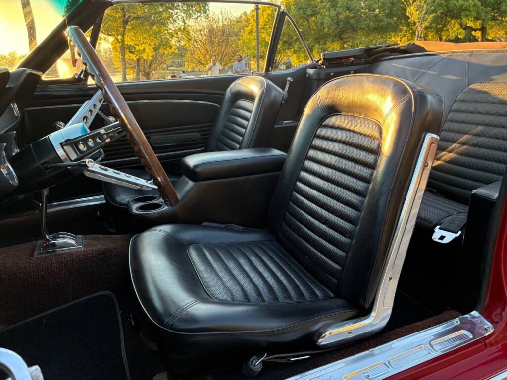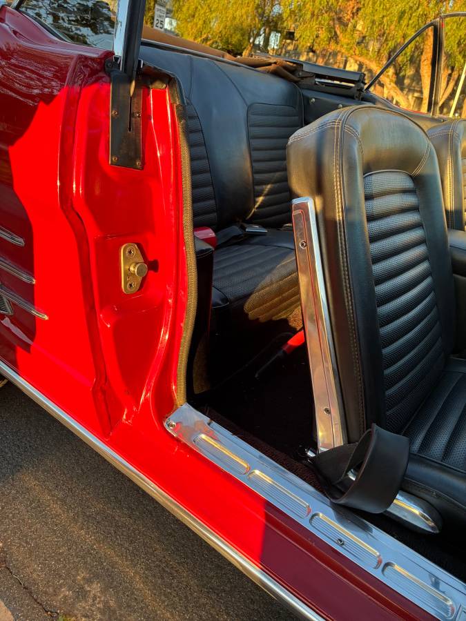 De lak is netjes. Het glimt goed en er is geen roest. De rode kleur komt goed uit met de witte strepen en het deels witte interieur. Een perfecte match! Hier en daar een imperfectie maar niets ernstigs. Er is geen roest aan deze Mustang. De bodemplaten zijn keurig in orde zoals je van een auto uit California mag verwachten, want daar komt deze Mustang oorspronkelijk vandaan.