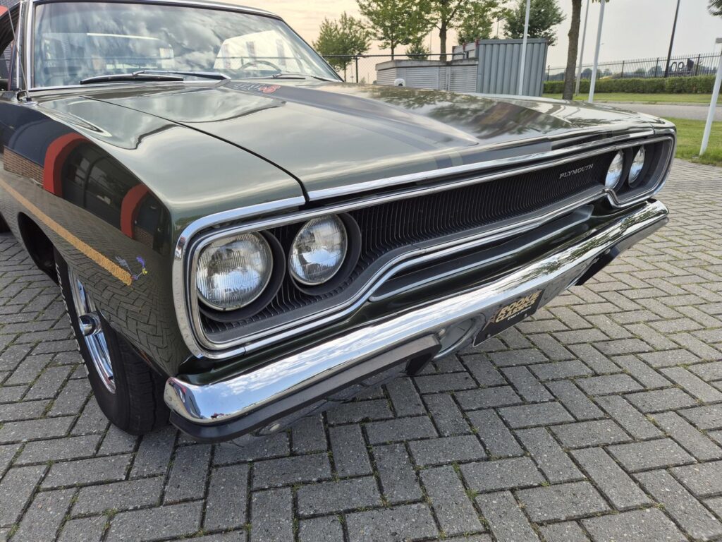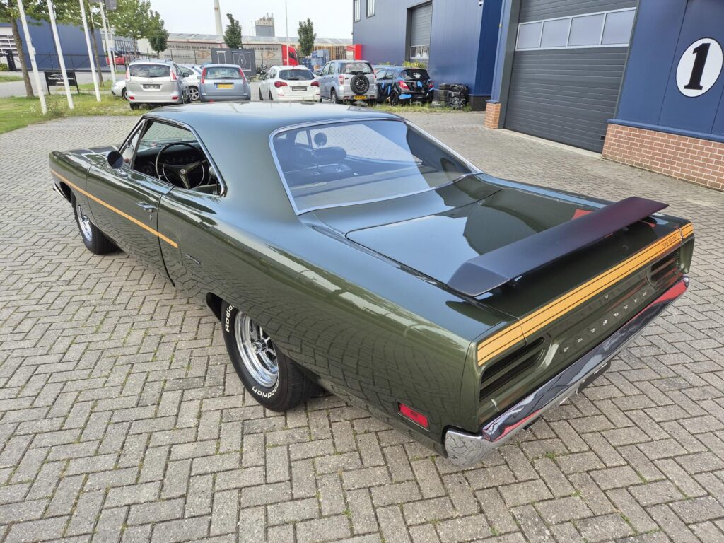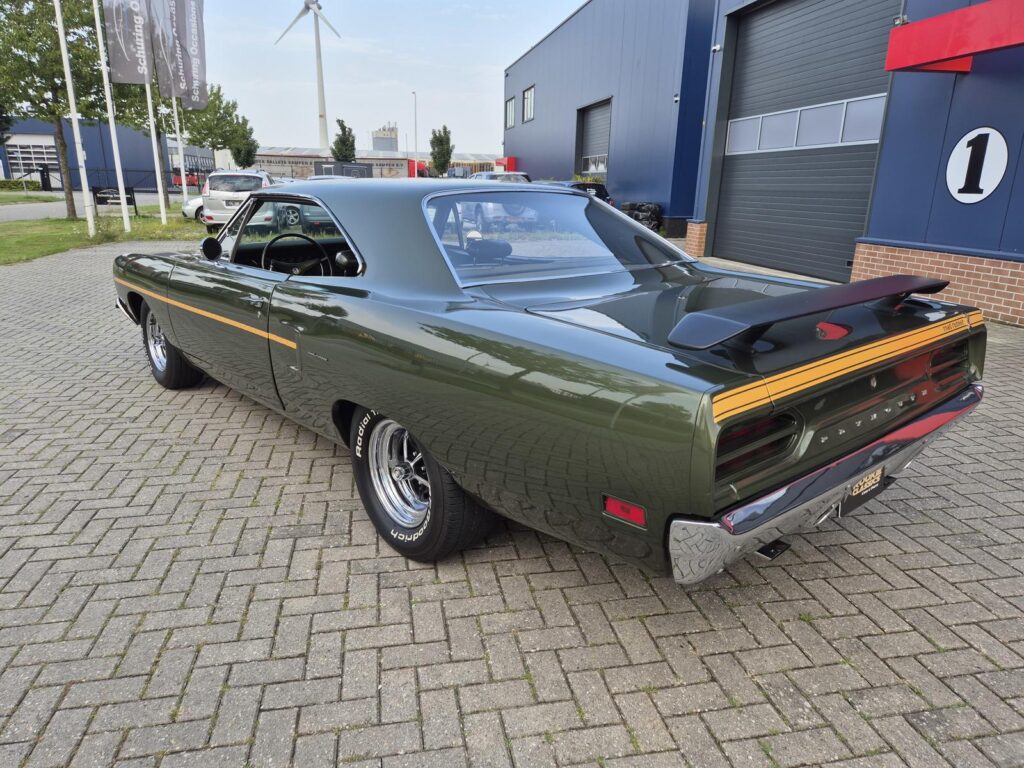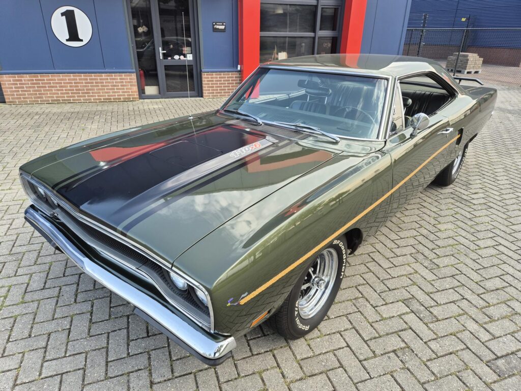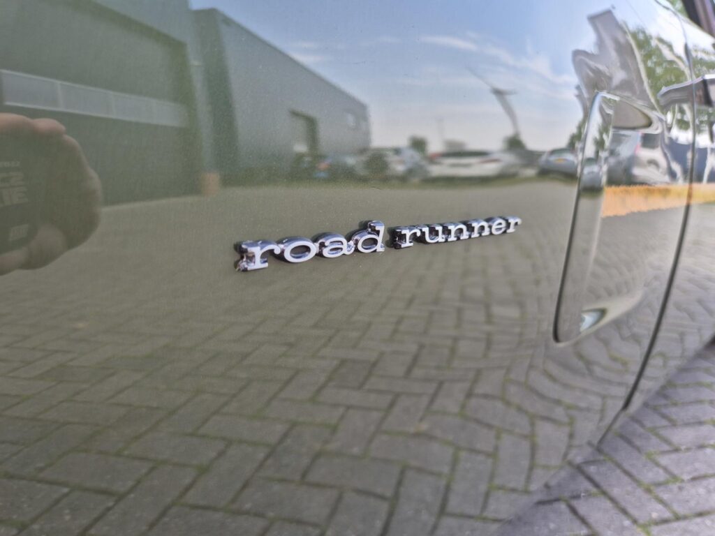 De Roadrunner is origineel geleverd met een 383 motor maar tijdens de restauratie is er gekozen voor de grotere 440+6 motor optie die deze RR nog stoerder maakt! De motor is periode correct en heeft een aantal performance opties meegekregen. Zo is er een performance nokkenas gemonteerd die de motor een lekkere sound geeft. Hooker Competition headers en electronische ontsteking zijn ook aangebracht.