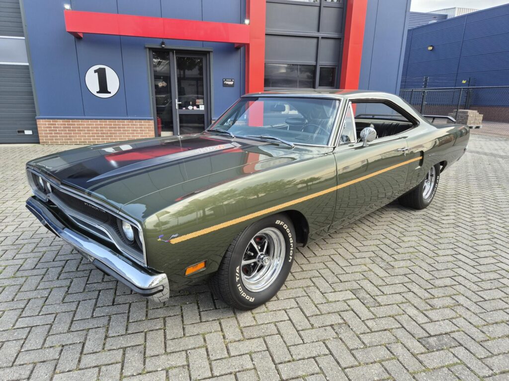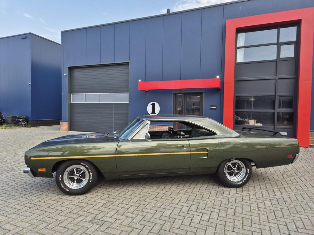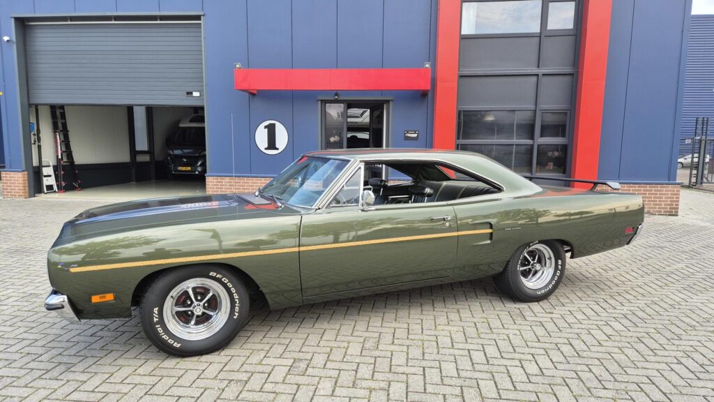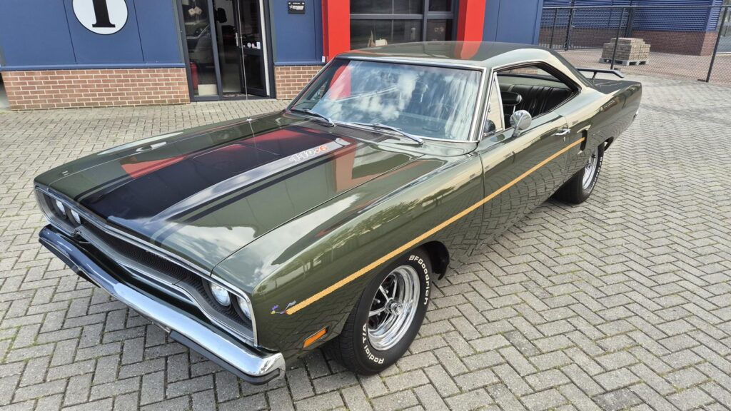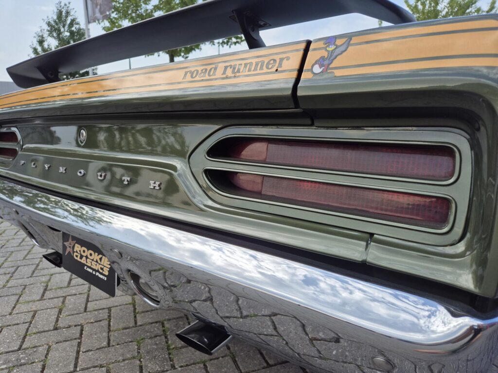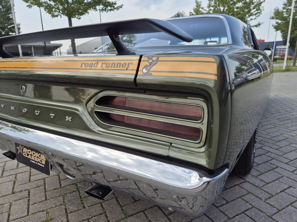 De Roadrunner is origineel geleverd met een 383 motor maar tijdens de restauratie is er gekozen voor de grotere 440+6 motor optie die deze RR nog stoerder maakt! De motor is periode correct en heeft een aantal performance opties meegekregen. Zo is er een performance nokkenas gemonteerd die de motor een lekkere sound geeft. Hooker Competition headers en electronische ontsteking zijn ook aangebracht.