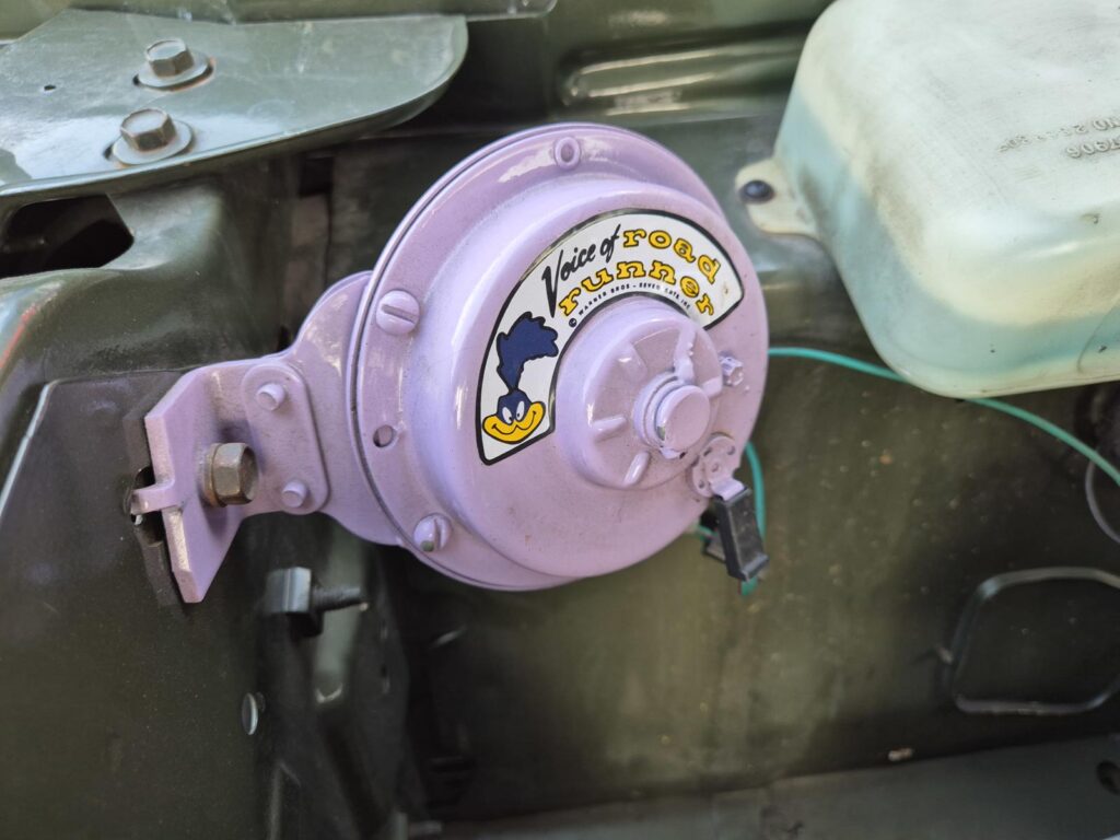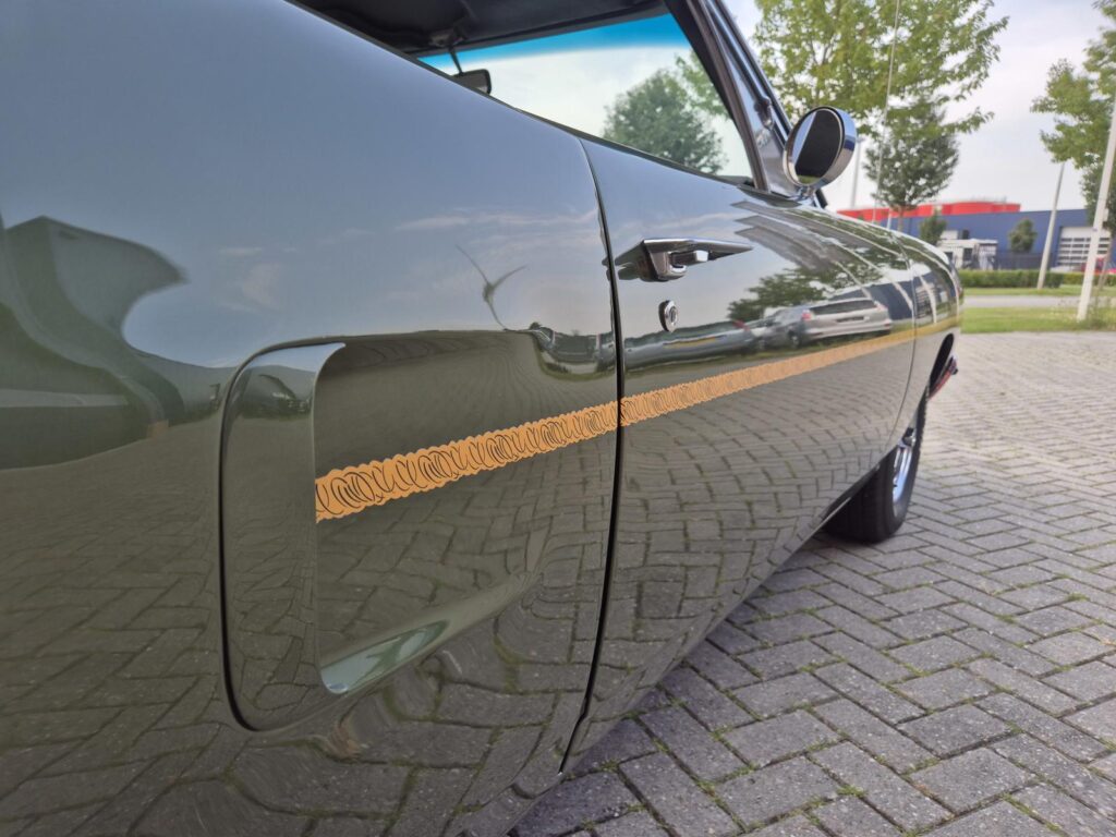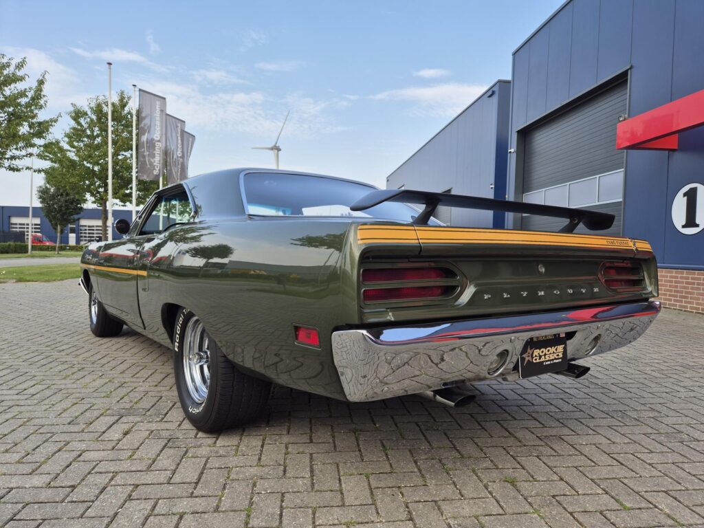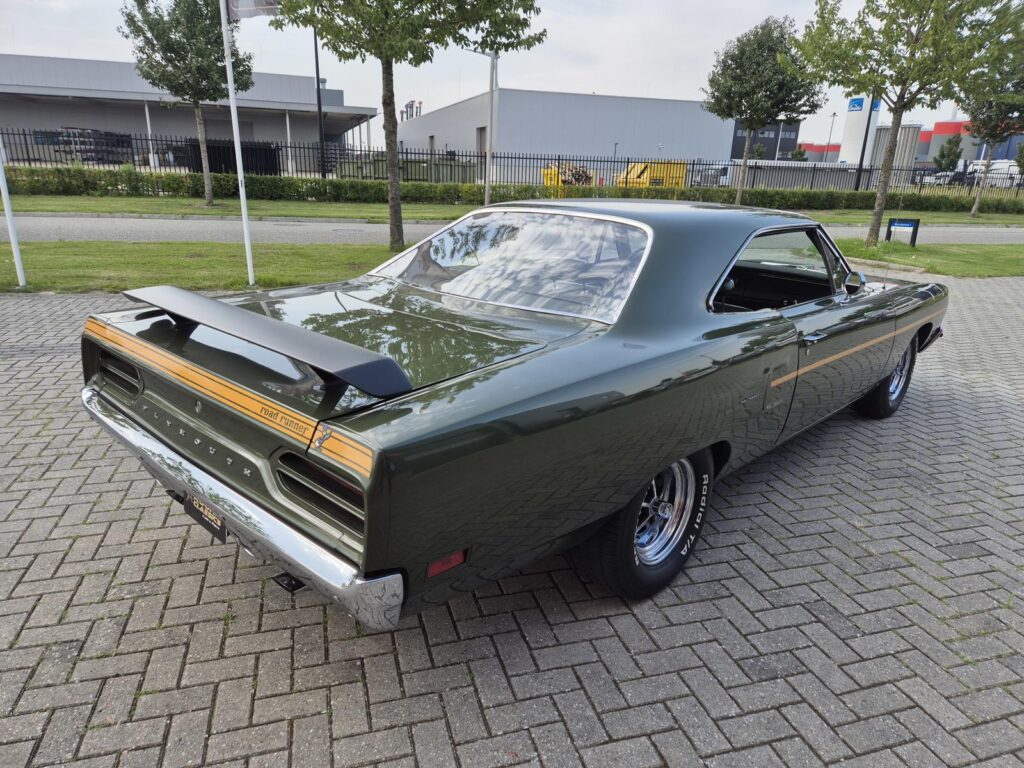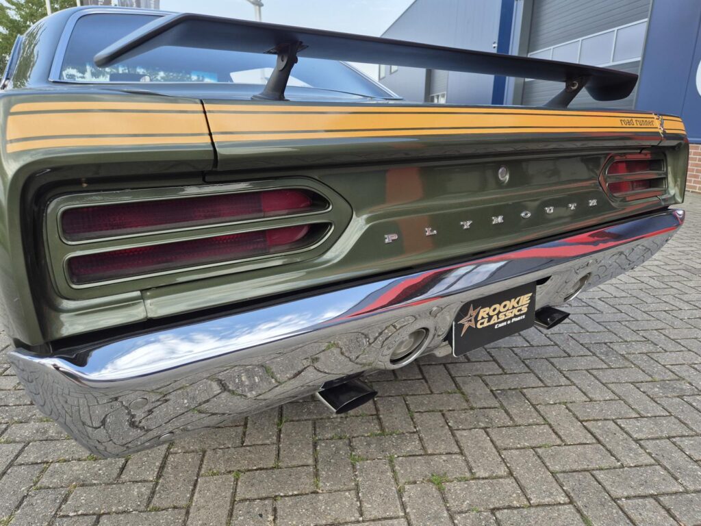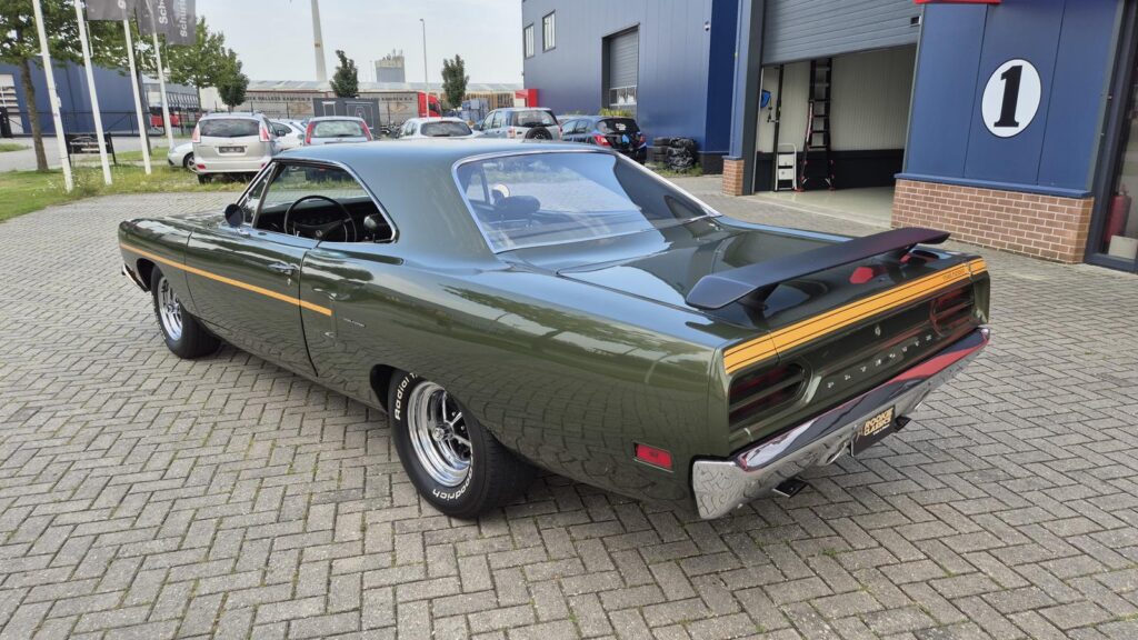 De Roadrunner is origineel geleverd met een 383 motor maar tijdens de restauratie is er gekozen voor de grotere 440+6 motor optie die deze RR nog stoerder maakt! De motor is periode correct en heeft een aantal performance opties meegekregen. Zo is er een performance nokkenas gemonteerd die de motor een lekkere sound geeft. Hooker Competition headers en electronische ontsteking zijn ook aangebracht.