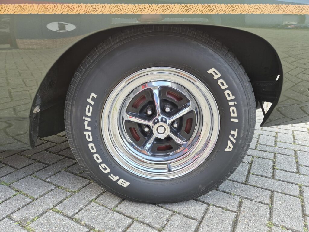 14 inch wielen met mooie witte letter banden maken deze auto helemaal af. Geweldig!